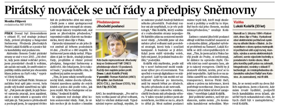V jihočeských médiích se o Pirátech psalo za posledních 30 dní 48 krát. Například vyšly články s pirátským lídrem a poslancem Lukášem Koláříkem, které naleznete v MF DNES a 5plus2 nebo rozhovor s Pirátem Martinem Kákonou na portálu Jižní Čechy Teď.
