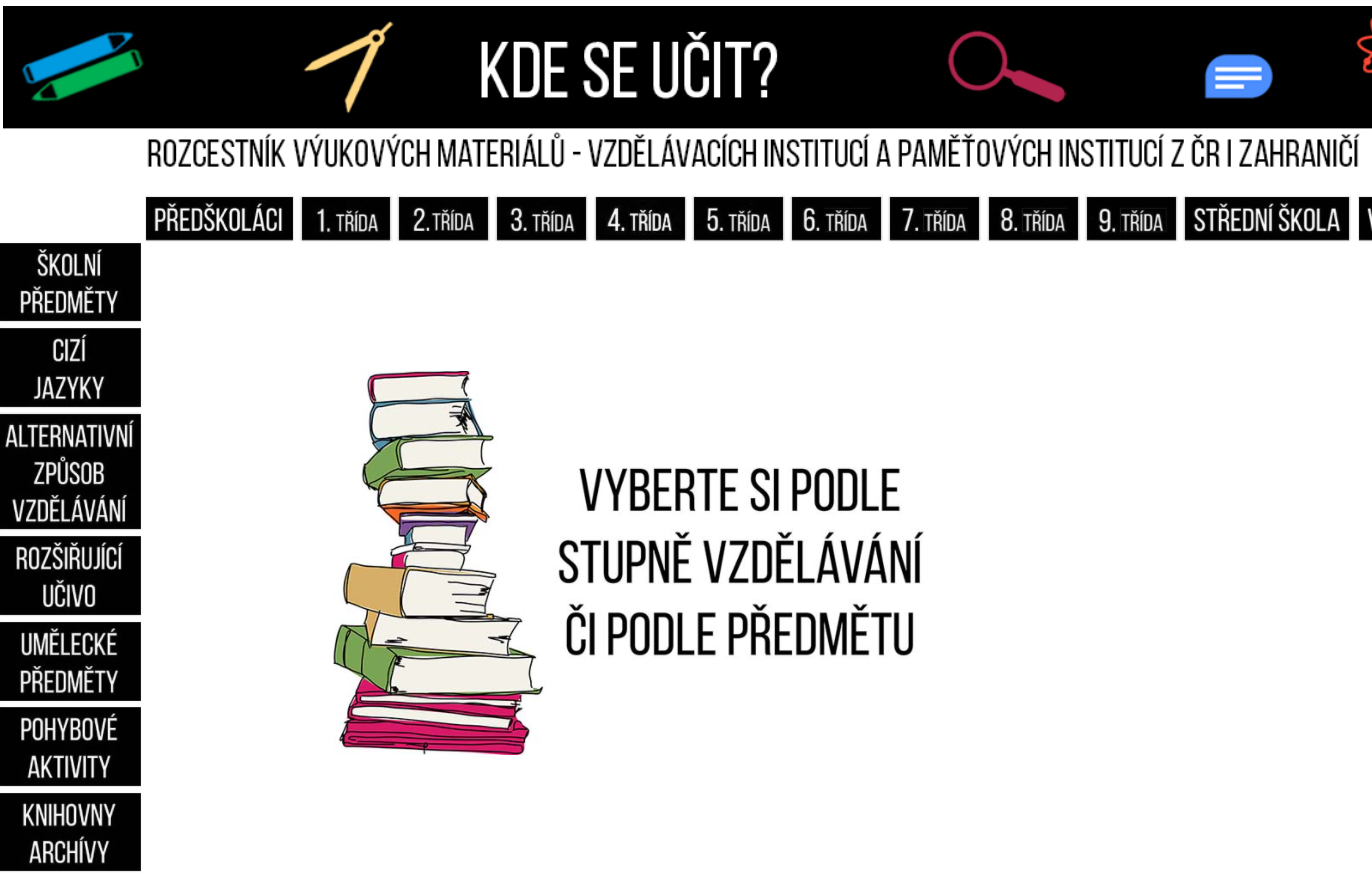 Stránky nekončí jen školními předměty, právě naopak. Školní předměty jsou jen první dvě kategorie, následují kategorie uměleckých aktivit, multimediální tvorby, pohybových aktivit, odkazů na zpřístupněné sbírky knihoven, galerií a další zajímavé zdroje.